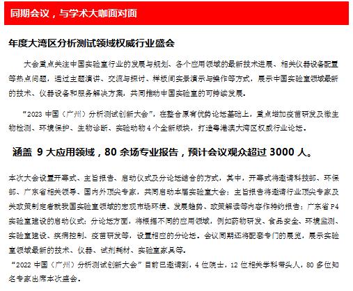 CHINA LAB 不光是企業(yè)展示新產(chǎn)品的最佳平臺,更是生命科學(xué)、醫(yī)藥醫(yī)療、食品藥品等行業(yè)最新研發(fā)及檢測技術(shù)的交流平臺。每年展會同期舉辦的“中國(廣州)分析測試創(chuàng)新大會”目前已經(jīng)成長為華南地區(qū)規(guī)格最高、影響力最大的分析測試領(lǐng)域?qū)W術(shù)論壇。今年論壇將重點聚焦生命科學(xué)領(lǐng)域,計劃邀請數(shù)位院士、專家教授及學(xué)術(shù)帶頭人做主旨報告,分享生命科學(xué)領(lǐng)域的最新研究成果。同時還將舉辦十余場專題分論壇,集中展示分析檢測技術(shù)在各個領(lǐng)域的最新進展,通過“學(xué)術(shù)會議+會展”的模式,促進多學(xué)科交叉協(xié)同發(fā)展。