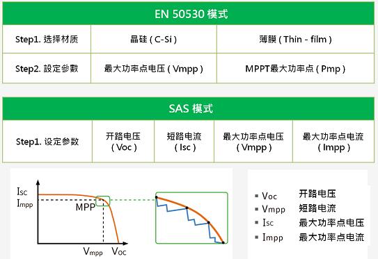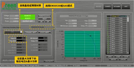 Preen的可編程直流電源具有響應(yīng)快速的特性,透過其DSP的設(shè)計(jì)架構(gòu),可快速運(yùn)算出以128點(diǎn)電壓及電流數(shù)組組成的IV曲線,適合快速執(zhí)行標(biāo)準(zhǔn)法規(guī)測(cè)試如:內(nèi)建的SAS與EN50530模式,至多只需要兩個(gè)步驟,系統(tǒng)即可自動(dòng)運(yùn)算出該模式下的其他參數(shù),并將IV曲線顯示于畫面中,實(shí)現(xiàn)最大功率點(diǎn)追蹤效率測(cè)試。