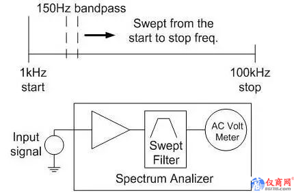 頻譜分析儀和示波器一樣,既有數(shù)字型的,也有模擬型的。模擬頻譜分析儀生成頻譜曲線的一種方法是:掃描各種頻率下的帶通濾波器,同時(shí)標(biāo)繪出濾波器的測量輸出值。另一種方法是運(yùn)用超外差接收技術(shù),該技術(shù)在各種頻率下完成對(duì)本地振蕩器的掃描。然而,數(shù)字頻譜分析儀則采用快速傅里葉變換來產(chǎn)生頻譜(常常與超外差接收技術(shù)配合使用)。