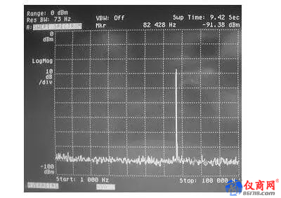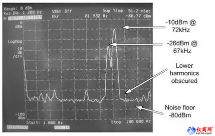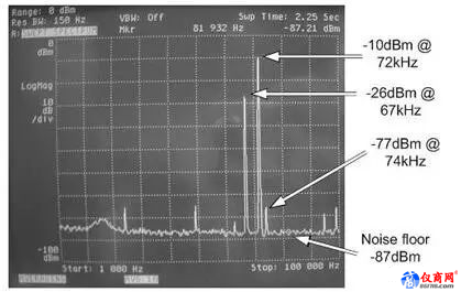 從圖 5.13 – 5.14 中,我們可以看出,當(dāng)分辨率帶寬降低時(shí),固有噪聲則從 –87 dBm 增加到 –80 dBm。另一方面,當(dāng)分辨率帶寬發(fā)生改變時(shí),頻率處于 67 kHz 和 72 kHz 時(shí)的信號(hào)幅度并未發(fā)生改變。固有噪聲之所以受分辨率帶寬的影響,是因?yàn)槠錇闊嵩肼?,因此,帶寬的提高也增加了熱噪聲總量。另外,由于信?hào)波形為正弦波曲線,而且不管帶寬如何變化,帶通濾波器內(nèi)部的振幅都會(huì)保持恒定,因此,頻率處于 67 kHz 和 72 kHz 時(shí)的信號(hào)幅度并不會(huì)受分辨率帶寬的影響。因?yàn)槲覀儽仨毲宄陬l譜密度計(jì)算中不應(yīng)該包含離散信號(hào),所以,有關(guān)噪聲分析方面的特性應(yīng)引起我們足夠的重視。比如,當(dāng)測量運(yùn)算放大器的噪聲頻譜密度時(shí),您會(huì)發(fā)現(xiàn)頻率在 60 Hz(功率上升線)時(shí)出現(xiàn)的一個(gè)離散信號(hào)。因?yàn)檫@個(gè) 60 Hz 的信號(hào)并非頻譜密度,而是一個(gè)離散信號(hào),所以它并未包含在功率噪聲頻譜密度曲線中。