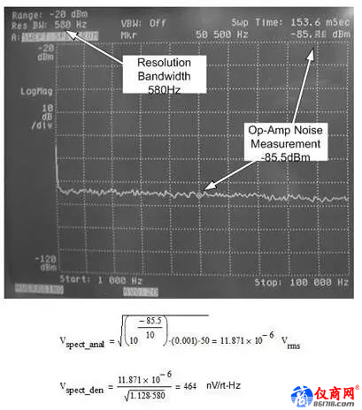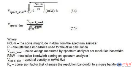 一些頻譜分析儀同噪聲頻譜密度一樣,可以 nV/rt-Hz 為單位顯示頻譜幅度。但是,如果不具備這種功能,我們可以用頻譜幅度除以分辨率噪聲帶寬的平方根來計(jì)算頻譜密度。需要說明的是,通常我們需要一個(gè)換算系數(shù),將分辨率帶寬轉(zhuǎn)化成分辨率噪聲帶寬。圖 1.6給出了將分貝毫瓦頻譜轉(zhuǎn)化成頻譜密度的方程式。圖 1.6還給出了將分辨率帶寬轉(zhuǎn)化成噪聲帶寬所需的換算系數(shù)表。圖 1.7 顯示了將示例頻譜分析儀中的頻譜轉(zhuǎn)化為頻譜密度的實(shí)例。