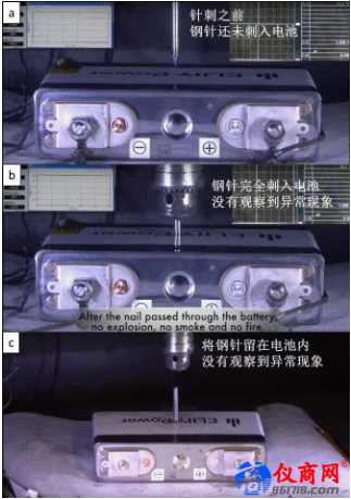 先看一下LFP/C電池的測(cè)試。LFP材料的熱穩(wěn)定性相對(duì)較高,在濫用測(cè)試中有助于抑制或延緩熱時(shí)空的發(fā)生。這里是ELIIY Power的50Ah(106Wh/kg)電池的一個(gè)案例,由TUV做的針刺測(cè)試。針刺刺入的位置在電池表面的中心。從鋼針刺入的整個(gè)過(guò)程來(lái)看,該電池沒(méi)有觀察到任何異?,F(xiàn)象,顯示出較高的安全性(圖2a-2c)。