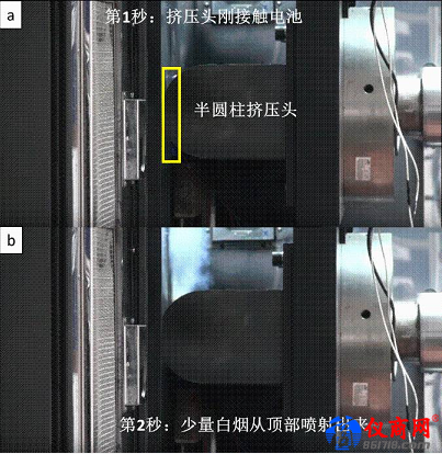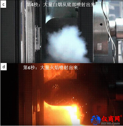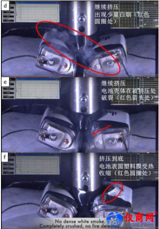 圖5是一個(gè)單體電池的擠壓測(cè)試的失敗案例。從擠壓頭開(kāi)始擠壓電池,電池就有少量白煙從頂部冒出(圖5b),接著就開(kāi)始噴射出大量白煙(圖5c),緊接著在第六秒鐘就噴射中大量火星和火焰,電池完全著火爆炸,數(shù)秒鐘之內(nèi),著火爆炸產(chǎn)生的氣體、煙霧、飛濺出來(lái)的殘留物就彌漫到整個(gè)測(cè)試房間內(nèi)。