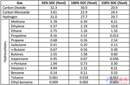 其中,在100%SOC和150%SOC下,體積含量最多的是一氧化碳、二氧化碳和氫氣。主要成分是一氧化碳、二氧化碳和氫氣,其余是烷烴、烯烴、苯等有機(jī)物,這些也可使可燃?xì)怏w。