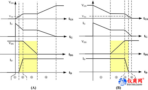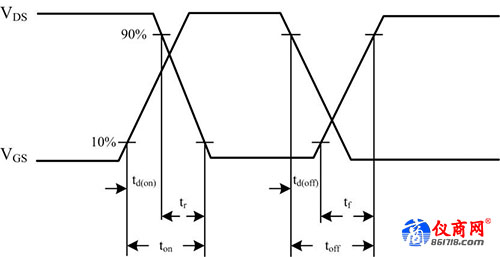 MOS管的損耗由開關損耗和驅動損耗組成,如圖1所示:開通延遲時間td(on)、上升時間tr、關斷延遲時間td(off)、下降時間tf。