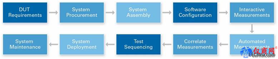 圖1. NI軟件工具在構(gòu)建、部署和維護(hù)測試系統(tǒng)的整個工作流程中可以相互支持和操作