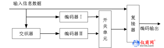 Turbo碼由兩個(gè)二元卷積碼并行級(jí)聯(lián)而成。Turbo編譯碼器采用流水線結(jié)構(gòu),其編譯碼基本思想是,采用軟輸入/軟輸出的迭代譯碼算法,編碼時(shí)將短碼構(gòu)成長(zhǎng)碼,譯碼時(shí)再將長(zhǎng)碼轉(zhuǎn)為短碼。Turbo碼的編碼結(jié)構(gòu)如圖所示。Turbo編碼器的結(jié)構(gòu)包括兩個(gè)并聯(lián)的相同遞歸系統(tǒng)卷積碼編碼器,二者之間用一個(gè)交織器分隔。編碼器Ⅰ直接對(duì)信源的信息序列分組進(jìn)行編碼,編碼器Ⅱ?yàn)榻?jīng)過(guò)交織器交織后的信息序列分組進(jìn)行編碼。編碼的全過(guò)程是,信息位一路直接進(jìn)入復(fù)接器,另一路經(jīng)兩個(gè)編碼器后得到兩個(gè)信息冗余序列,再經(jīng)恰當(dāng)組合,在信息位后通過(guò)信道。為了使編碼器初始狀態(tài)置于全零狀態(tài),需在信息序列后添加mbit尾信息(未必全是0);但由于交織器的存在,編碼器Ⅱ在數(shù)據(jù)塊結(jié)束時(shí)不能回到零狀態(tài)(要使兩個(gè)編碼器同步置零,必須設(shè)計(jì)合適的交織器)。
