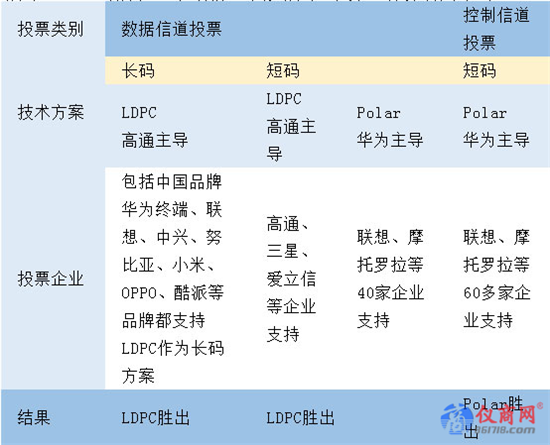 最終會(huì)議達(dá)成結(jié)果如下表所示,確定將LDPC碼作為eMBB數(shù)據(jù)信道的編碼方案,Polar碼作為eMBB控制信道的編碼方案進(jìn)入了5G后續(xù)的標(biāo)準(zhǔn)化討論。