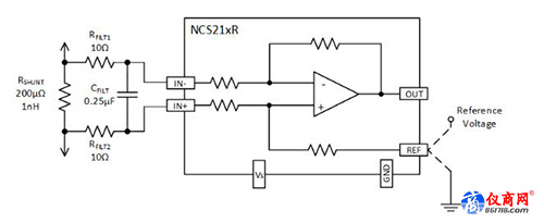 其他應(yīng)用,如DC-DC轉(zhuǎn)換器和電源應(yīng)用也可能需要在電流檢測放大器的輸入端進(jìn)行濾波。圖1所示為建議的輸入濾波原理圖。