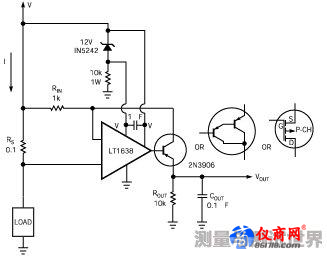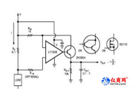 這個電路存在幾個潛在的誤差來源。很顯然,你要確保電流檢測電阻器具有應(yīng)用所必需的精確度。再者,你要確保增益電阻器(ROUT/RIN)很精確。R'IN是 選件,用來進一步降低由運算放大器的輸入偏置電流引起的任何失調(diào)誤差。除此之外,你還得在輸出晶體管上費些腦筋。如果你使用雙極結(jié)型晶體管,則附加的基極 電流會產(chǎn)生輸出誤差。如果雙極結(jié)型晶體管具有的β為100(β=100),你就可以預(yù)料到輸出會提高1%(即1/β,用百分比表示)。你可以用達林頓晶體 管來大大降低這種誤差。此外,你也可以使用MOSFET,這種器件因其源極電流和漏極電流完全相同,不存在這種等效的基極電流誤差。但是,由于可能存在由 MOSFET漏電流引起的誤差,所以漏電流小的器件是最佳選擇。這種漏電流只是在測量零電流或甚小電流值時才會產(chǎn)生誤差,但是不會像雙極結(jié)型晶體管那樣產(chǎn) 生“增益”誤差。