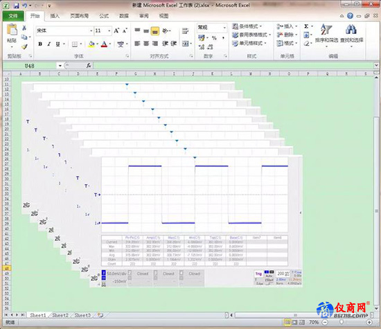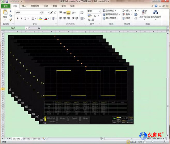 如圖3所示,Wave_Analyze軟件點(diǎn)擊一次設(shè)備持續(xù)截圖到剪貼板后,在Microsoft Excel里面連續(xù)按10次Ctrl+V粘貼,可以得到10張不同的示波器截圖。