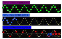 下圖中第一個圖形表明在采樣率足夠的前提下,觀察多個周期的樣本,需要的存儲深度很長,圖示中需要36個采樣點。第二個圖形采樣率依然保持方便,但存儲深度變小,只有9個采樣點,因此只能采樣一個周期多點的波形。第三個波形仍然是存儲深度很小,只有9個采樣點,但仍然要采樣和第一個圖形一樣多個周期的波形,其結(jié)果是采樣率變小,測量得到的波形就會失真。