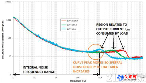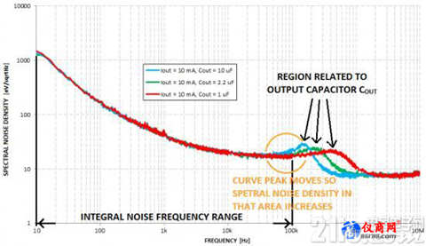 但是,如何表示LDO輸出的噪聲有多大呢?可用如上文所示的積分噪聲頻率范圍表示。這個(gè)范圍通常是10赫茲至100千赫。