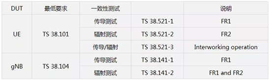 3GPP規(guī)定了用戶設備(UE)和基站(gNB)的 5G NR 測試要求。下表列出了 UE 和 gNB 的最低測試要求和一致性測試的技術規(guī)范(TS)。