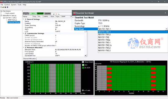 圖1 顯示了 FR1 的 5G NR TM1.1。整個無線幀的圖形在左下角顯示。x 軸表示基于當前參數(shù)集的時隙,y 軸表示資源塊(RB)值。幀中使用的各種信道類型用不同顏色表示: 綠色表示下行鏈路共享信道(DL-SCH),淺綠色表示下行鏈路控制信息(DCI)。在右下角顯示的是詳細的 RB 映射,包括紅色的解調(diào)參考信號(DMRS)和綠色的物理下行鏈路共享信道(PDSCH)。預配置的設置可幫助您生成符合 3GPP 5G NR 標準的信號, 以便快速輕松地測試 gNB、UE 發(fā)射機和接收機,如右上方所示。