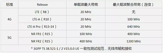 增強型移動寬帶(eMBB)是為 5G 定義的用例之一。它通過結(jié)合使用現(xiàn)有技術和新技術來實現(xiàn)預期的極高數(shù)據(jù)吞吐量,包括更寬的信道帶寬、載波聚合、高調(diào)制密度和多天線配置。5G NR 在 FR2 中的最大信道帶寬為 400 MHz,最大聚合信道帶寬(連續(xù))高達1.2 GHz。通常情況下,隨著信道帶寬增加,信道平坦度降低。下表列出了新無線標準的最大信道帶寬和聚合帶寬。
