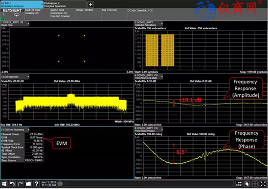 圖4 顯示了使用 400 MHz 帶寬并開啟內(nèi)部信道校正功能后,測量 5G NR 信號所得到的結(jié)果。幅度的頻率響應小于 ±0.1 dB,相位為 0.5 度,這表明其性能十分優(yōu)異。