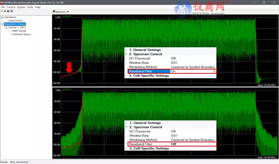 使用和未使用基帶濾波器時的5G NR 信號頻譜仿真