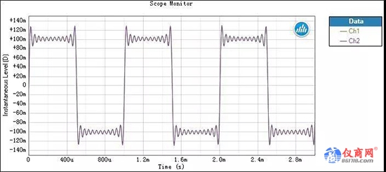 方波在時域上也有類似的波形表現(xiàn),如上圖所示。方波可以通過數(shù)學(xué)方法表示,它包含基頻正弦波和所有同相位的奇次諧波,奇次諧波的幅度隨著諧波次數(shù)的提高而按比例遞減。所以,三次諧波的幅度是基波幅度的1/3,五次諧波的幅度是基波幅度的1/5,以此類推。