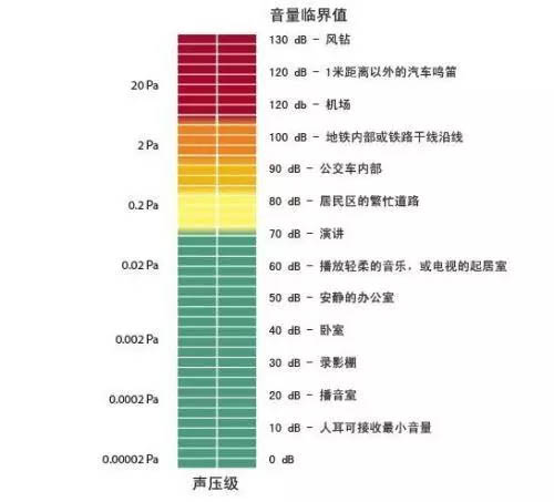 即聲壓變?yōu)樵瓉?lái)的10倍,聲壓級(jí)在原來(lái)的基礎(chǔ)上增加20dB;聲壓變?yōu)樵瓉?lái)的2倍,聲壓級(jí)在原來(lái)的基礎(chǔ)上增加6dB;另外,當(dāng)聲壓達(dá)到20Pa,即聲壓級(jí)為120dBSPL時(shí),人耳會(huì)感覺到疼痛,因此,在聲學(xué)或醫(yī)學(xué)上把20Pa=120dBSPL定義為痛閾,長(zhǎng)時(shí)間在此環(huán)境下工作,會(huì)對(duì)聽覺系統(tǒng)造成傷害。