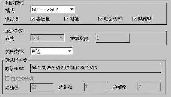 2.選擇測(cè)試使用的測(cè)試端口與測(cè)試模式方向,設(shè)定設(shè)備類型,幀長(zhǎng)度等參數(shù),勾選所需要的測(cè)試項(xiàng)(吞吐量、時(shí)延、幀丟失率、背靠背)。