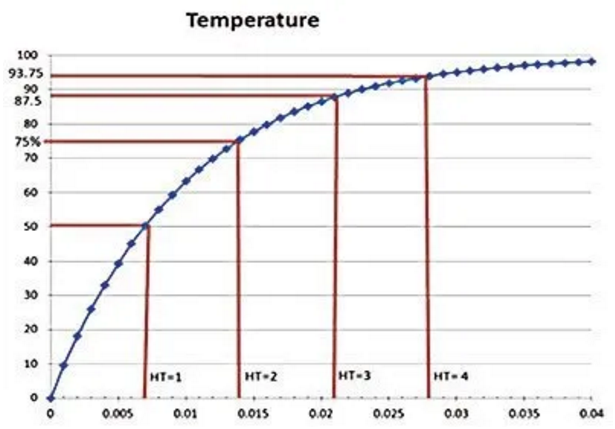 為了探討微測輻射熱計探測器的響應時間,我們來打一個有趣的比方,假想有兩桶水:一桶是裝滿已攪拌均勻的0℃冰水,另一桶是100?C快速沸騰的沸水。讓微測輻射熱計探測器先對準冰水,然后瞬間切換到沸水(100?C的躍階輸入),記錄這一過程的測溫結果。如果我們將10ms的熱時間常數(shù)轉換成一半時間以便于計算,我們得到的值大約為7ms。