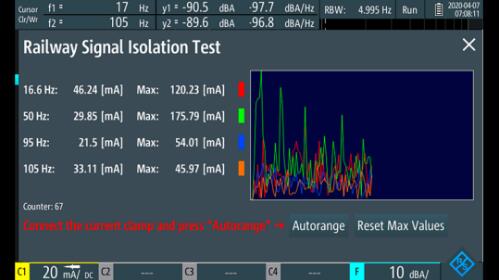 RTH-K18頻譜分析選件可以輕松測(cè)量頻率。借助此選件,工程師可以使用示波器的光標(biāo)和記錄功能測(cè)量并記錄特定頻率下的頻譜分量。在本例中,需要在162/3Hz、50Hz、95Hz和105Hz四個(gè)不同頻率下測(cè)量信號(hào)電流,并以安培為單位顯示信號(hào)幅度。顯然,任何手持式示波器均未標(biāo)配此測(cè)量功能。此外,還需要在示波器上自動(dòng)執(zhí)行設(shè)置、顯示電流最大值并支持圖形顯示,以盡量讓工程師進(jìn)行簡(jiǎn)單操作。