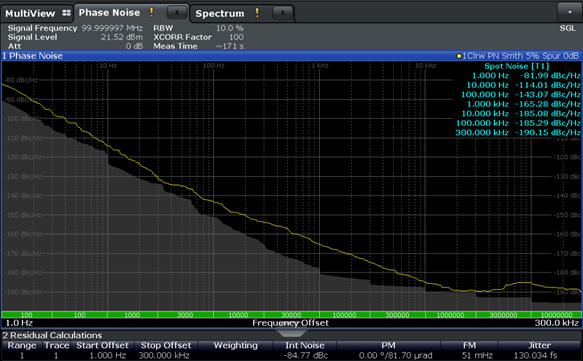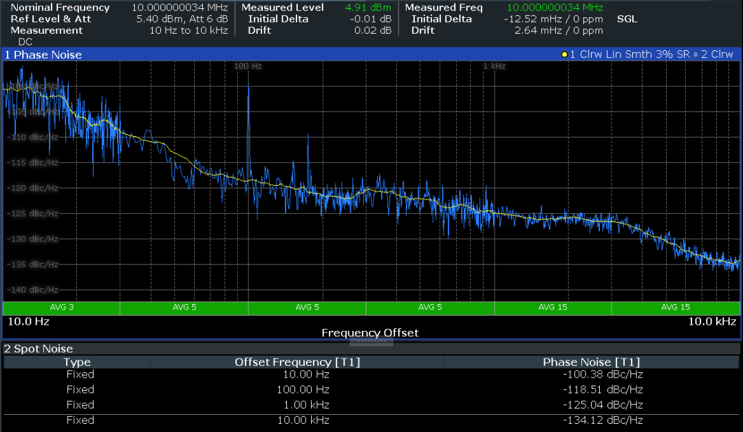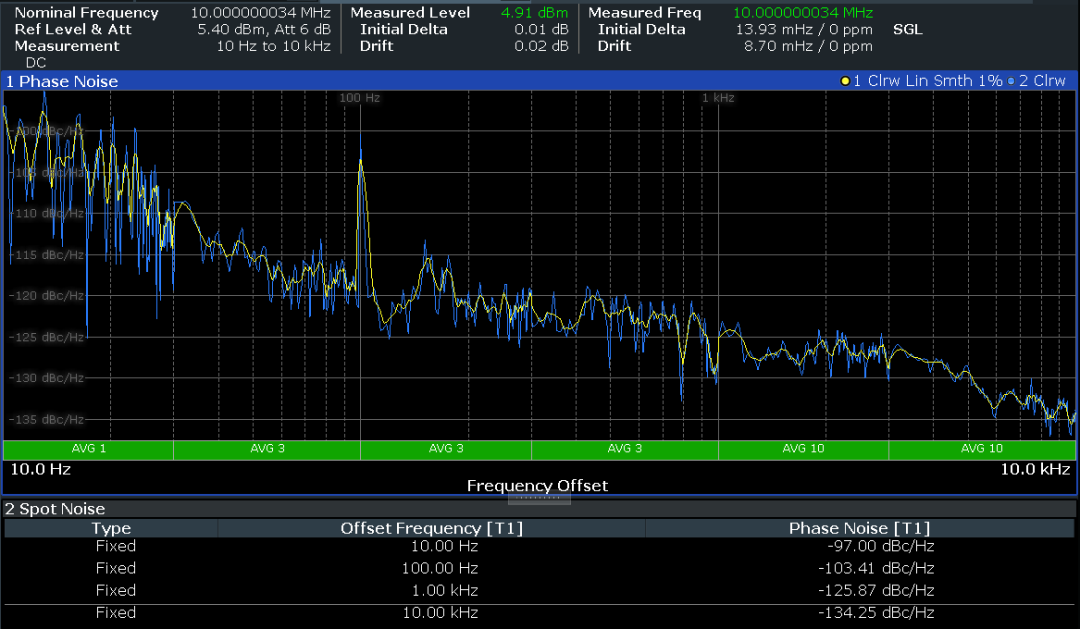 · 此時(shí)trace1顯示平滑,100Hz處移除雜散,相噪數(shù)據(jù)-118.51dBc/Hz,遠(yuǎn)優(yōu)于上圖結(jié)果-103.41dBc/Hz。