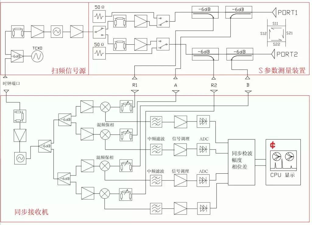 與天線分析儀類似,雙端口測試時,幅度的變化、相位的變化可以用幅度檢波器、鑒相器等裝置加以比較得到。只不過參與比較的不再是正反向信號,而是輸入信號和輸出信號。
