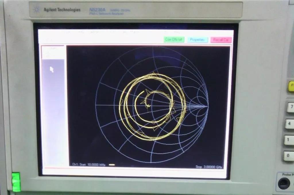 圖:用矢量網(wǎng)絡(luò)分析儀測一臺信號源的輸出阻抗,此時信號源正在進行掃頻工作,可以明顯的看到信號源的輸出對矢網(wǎng)的干擾(尖峰),事實上阻抗也不正確(圓環(huán)狀曲線半徑變大了)–科創(chuàng)儀表局供圖