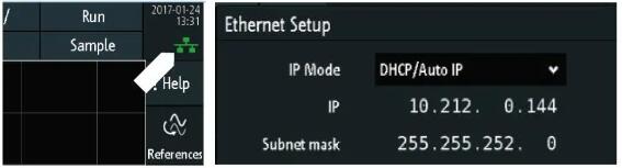2.示波器從網(wǎng)絡(luò)DHCP服務(wù)器獲取IP地址后,LAN圖標(biāo)變成綠色。如果您的網(wǎng)絡(luò)需要預(yù)定義的固定IP地址,請(qǐng)聯(lián)系您的管理員獲取;