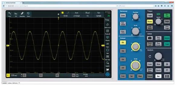 如需與示波器交互,可以使用前述遠(yuǎn)程前面板。在此視圖中,可以直接控制所有元素。比如,點(diǎn)擊“自動(dòng)設(shè)置”(Autoset)按鈕即可啟動(dòng)自動(dòng)設(shè)置,如同按下真的按鈕一樣。
