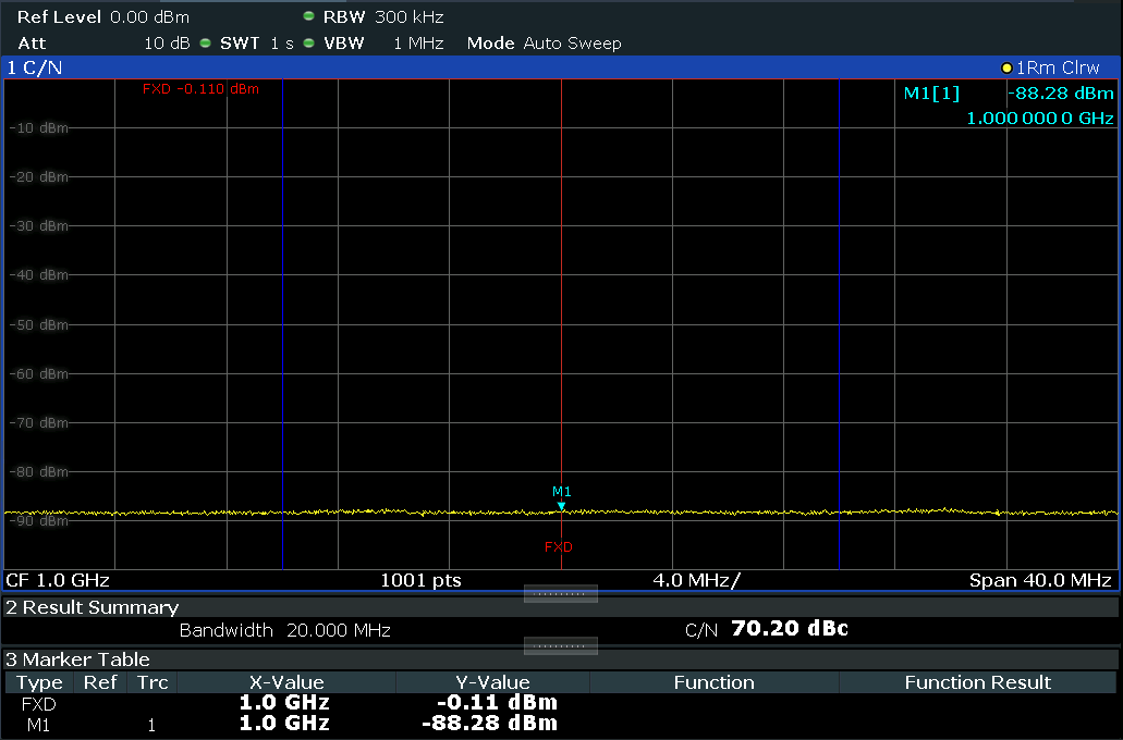 在Marker標(biāo)記點(diǎn)處,根據(jù)RBW自動(dòng)計(jì)算并顯示該頻點(diǎn)功率密度;