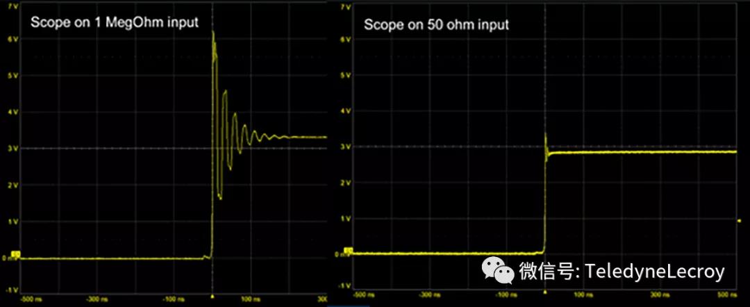 如果使用50歐姆的電纜,則信號(hào)在傳播到示波器時(shí),會(huì)看到50歐姆的瞬時(shí)阻抗。當(dāng)它進(jìn)入示波器時(shí),如果我們可以使瞬時(shí)阻抗保持恒定,則不會(huì)有反射,并且會(huì)在示波器中看到由信號(hào)源發(fā)射到電纜中的實(shí)際電壓。
