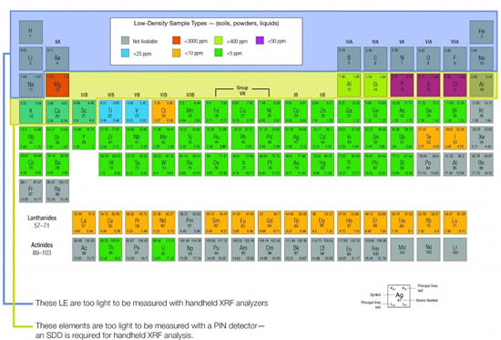 氫(H)到鈉(Na): 這些LE (藍(lán)色區(qū)域內(nèi)的) 我們無法使用手持式XRF分析儀探測到。鎂 (Mg) 到鈧 (Sc): 這些元素 (黃色區(qū)域內(nèi)) 無法用PIN探測器檢測—需要使用搭載了SDD探測器的手持式XRF分析儀。