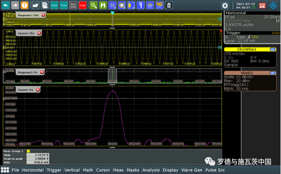 FFT:橫軸頻率,縱軸功率電平dBm,對應(yīng)信號電壓的RMS值的平方比內(nèi)阻值。