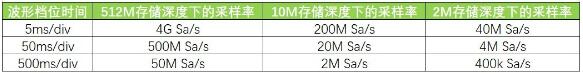 絕大多數(shù)示波器是不標稱存儲深度的,只標稱最佳采樣率而不標稱實時采樣率,如下圖所示。