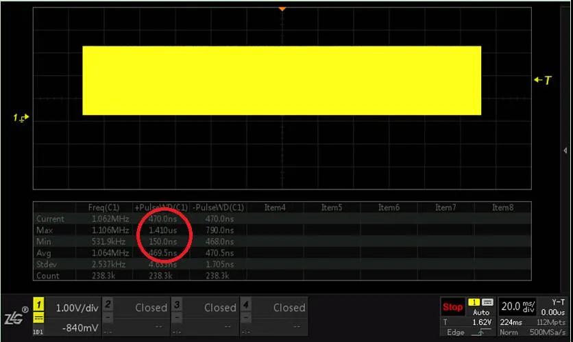 舉例:捕獲224ms波形,發(fā)現(xiàn)脈寬最值與均值差別較大,則此信號存在脈寬偶發(fā)異常。