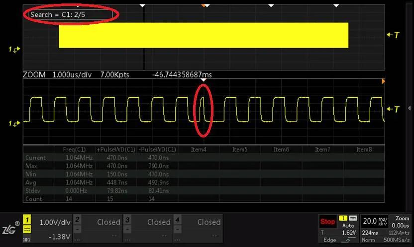 通過波形搜索輕松定位出224ms波形中一共5處異常,周期性出現(xiàn),周期約為50ms。