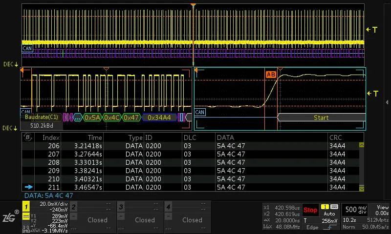 如圖所示,示波器記錄了10.2s的CAN波形并全部解碼生成事件表,我們可以將事件表導出,也可以使用上位機軟件做DBC解析,將解碼升華到協(xié)議層,大存儲深度使解碼功能產(chǎn)生了質(zhì)變。