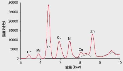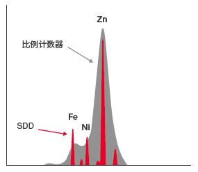在圖中,紅色譜峰是使用SDD獲得的結(jié)果;灰色是用比例計數(shù)器測量的同一樣品譜圖。SDD不會像比例計數(shù)器那樣易受到大氣溫度變化的顯著影響。在檢出限非常低的情況下,這一特點非常重要。因此,對于非常 薄或復(fù)雜的鍍層,SDD是最佳選擇。