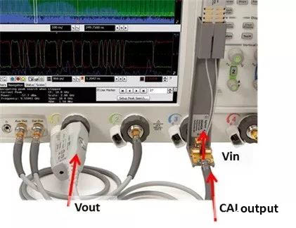 如圖所示,示波器cal out輸出快沿信號,由示波器的兩個通道測試校準信號cal out在探頭輸入前端信號Vin和探頭測量輸出信號Vout,通過對Vout/Vin的修正校準帶內(nèi)的頻率響應(yīng)。
