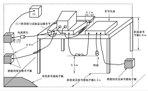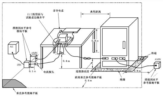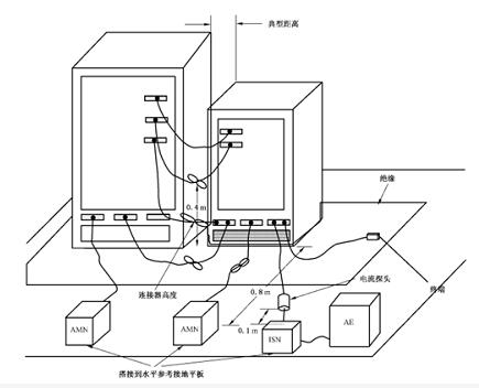 測試時被測件擺放的位置,包括電纜的擺放,輔助設(shè)備的擺放,設(shè)備之間的距離等,最好保持一致。我們可以參考GB9254中傳導(dǎo)騷擾測試的布置方法,如下圖: