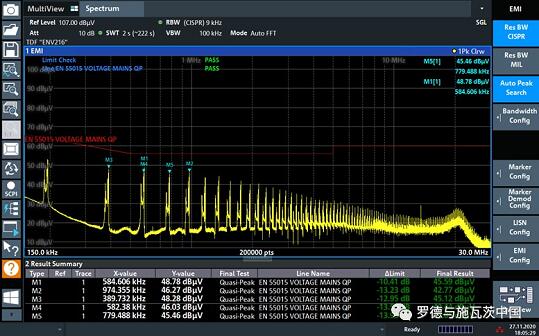 電磁干擾 (EMI) 方面同樣需要確保一致性。相應(yīng)的EMI標(biāo)準(zhǔn)要求使用適當(dāng)?shù)?EMI 檢測(cè)器 (準(zhǔn)峰值、CISPR-Average和MS-Average (CISPR-RMS)) 測(cè)量最低數(shù)量的雜散。信號(hào)與頻譜分析儀可進(jìn)行對(duì)應(yīng)的預(yù)一致性測(cè)量。