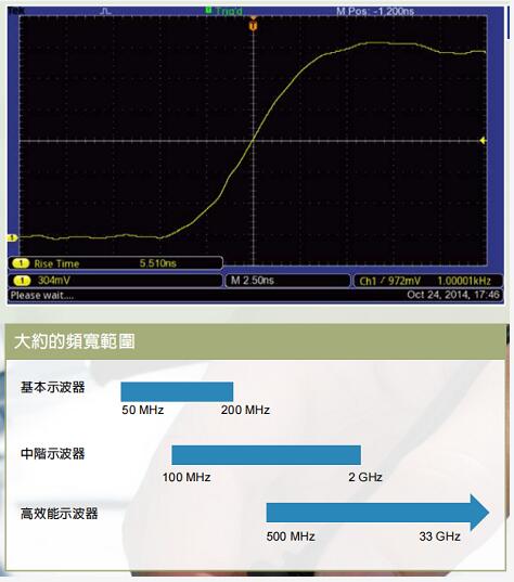基本示波器的范圍通常為50 MHz至200 MHz。如果您需要更多的頻寬,則可使用更高效能示波器,以涵蓋350 MHz以上,可達數(shù)十個GHz的范圍。