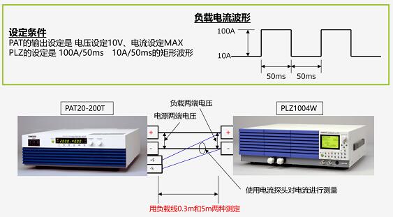 使用菊水的高效率大功率開(kāi)關(guān)電源PAT20-200T,通過(guò)改變電纜長(zhǎng)度測(cè)量下圖設(shè)定條件下,矩形波負(fù)載電流流過(guò)時(shí)的電源端子、負(fù)載端子電壓的變化。