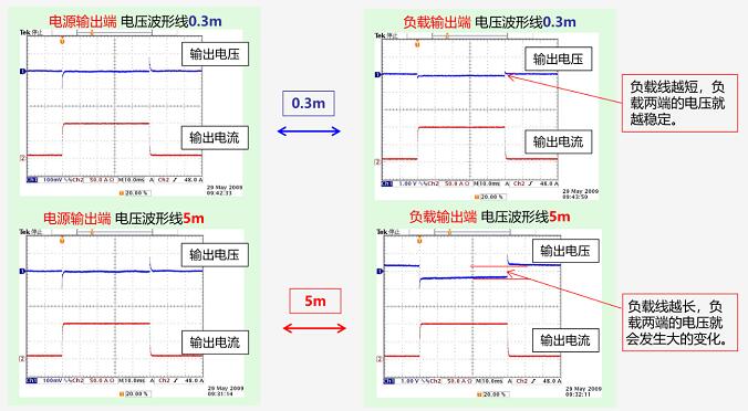 通過(guò)以下的波形圖可以發(fā)現(xiàn),電源輸出端的電壓在電纜長(zhǎng)度為0.3m、5m時(shí)沒(méi)有很大的變化。而負(fù)載輸出端的電壓在電纜長(zhǎng)度為0.3m、5m時(shí)則發(fā)生了大幅的變化。