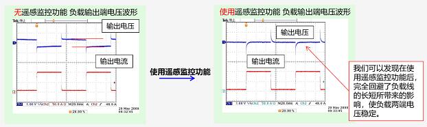 在電纜長(zhǎng)度5m的狀態(tài)下,比較不使用遙感監(jiān)控功能和使用時(shí)的負(fù)載輸出端的電壓波形。使用遙感監(jiān)控功能時(shí),負(fù)載輸出端的電壓沒(méi)有變化,而電壓也相對(duì)穩(wěn)定。