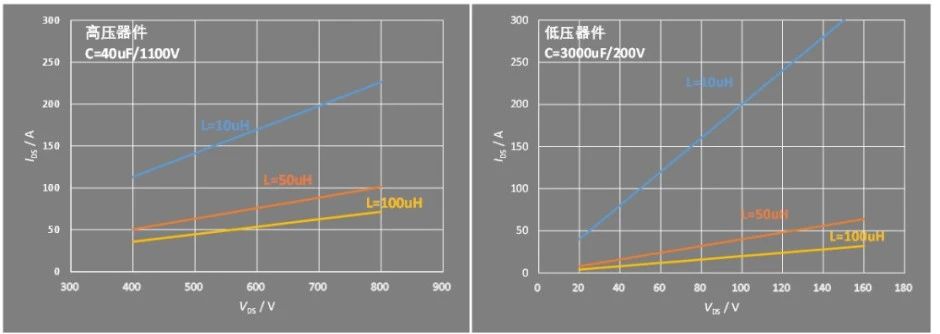 高壓器件為了滿足高壓的測(cè)試需求,須選擇耐壓值高的母線電容,但此類電容容值較小,如用該電容來(lái)測(cè)試低壓器件,能夠?qū)崿F(xiàn)的最大電流將大打折扣。對(duì)于功率器件來(lái)說,耐壓和導(dǎo)通電阻是一對(duì)矛盾的關(guān)系,低壓器件往往需要更大測(cè)試電流,所以低壓器件應(yīng)選擇容值更大的母線電容。此外,由上圖可知,在測(cè)試電壓相同,負(fù)載電感越小可實(shí)現(xiàn)的最大電流值越大,為了滿足低壓器件大電流的要求,也應(yīng)選擇感量更小的負(fù)載電感。