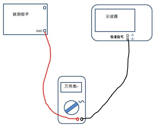 (2)接線:示波器和被測(cè)板子分別接好電源,暫不通電;萬(wàn)用表的表筆一端接示波器校準(zhǔn)信號(hào)的地,另一端接被測(cè)板子的地。簡(jiǎn)易接線圖如圖3所示;